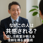2025年9月25日 / 最終更新日 : 2025年9月24日 comcollege 話し方教室 教養講座 「なぜこの人は共感される?話し方教室が教える信頼を得る会話術」(じっくり教養 話し方教室東京) ビジネスや日常生活の中で「この人の話はなぜか信頼できる」と思わせる人がいます。その秘密は、ただ話が上手いだけではなく、聞き手の心を動かす「共感を呼ぶ会話術」にありそうです。 今回は、共感される人の話し方の秘密を紐解いてみ […]